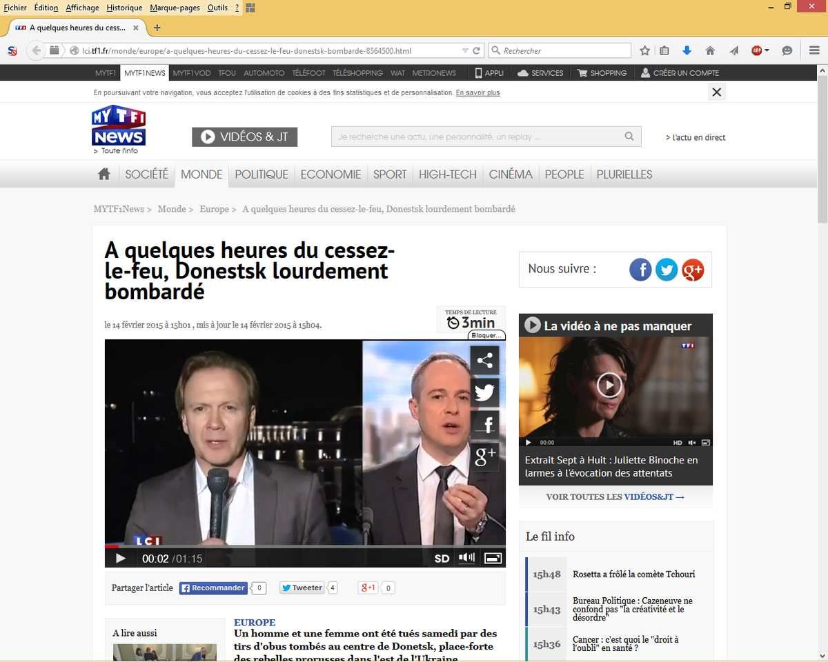 Donetsk : "Des obus sont tombés à 200 m de l'immeuble de la présidence de la République", LCI.tf1, http://videos.tf1.fr/infos/2015/donetsk-des-obus-sont-tombes-a-200-m-de-l-immeuble-de-la-presidence-8564498.html